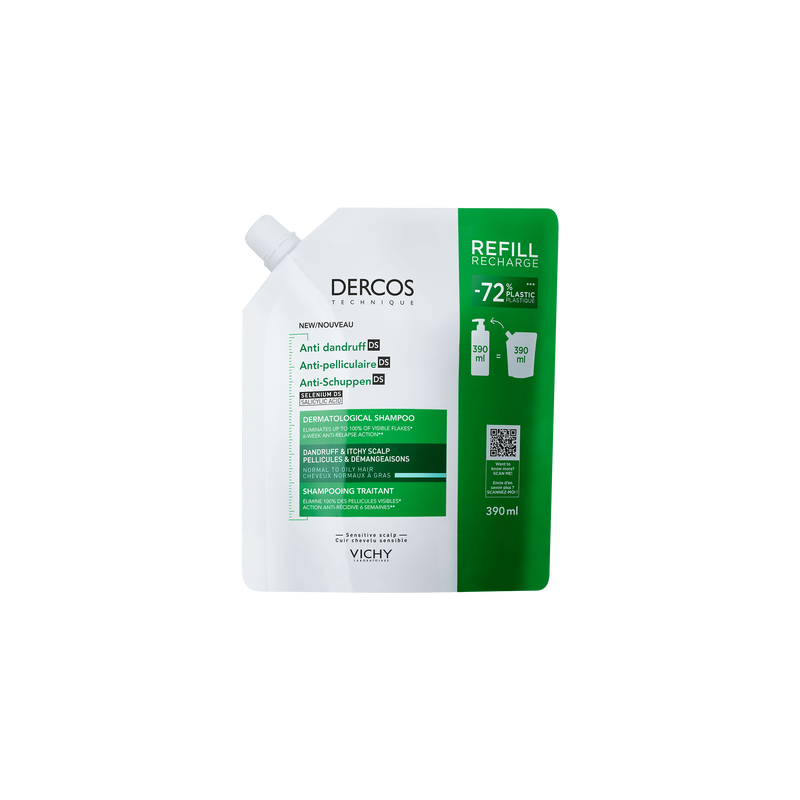 Recarga del Dercos DS champú anticaspa para cabellos normales a grasos que cursan con caspa y picor, diseñada para reponer el envase original cuando se agote el producto, contribuyendo así al reciclaje y disminución de los plásticos.