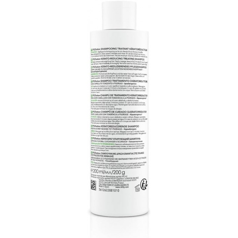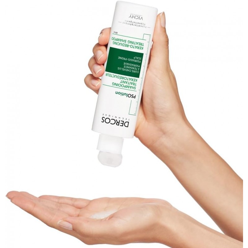Dercos Champú Keratorreductor PSOlution 200 ml de Vichy está especialmente formulado para tratar el cuero cabelludo con descamación intensa, irritación o picor persistente, asociado a condiciones como la psoriasis o dermatitis seborreica. Su fórmula combina ácido salicílico, urea y glicerina, activos queratorreductores y calmantes que eliminan las escamas visibles, suavizan la piel y restauran su confort natural.