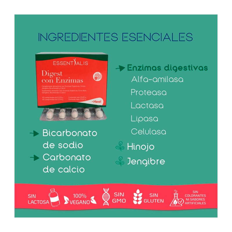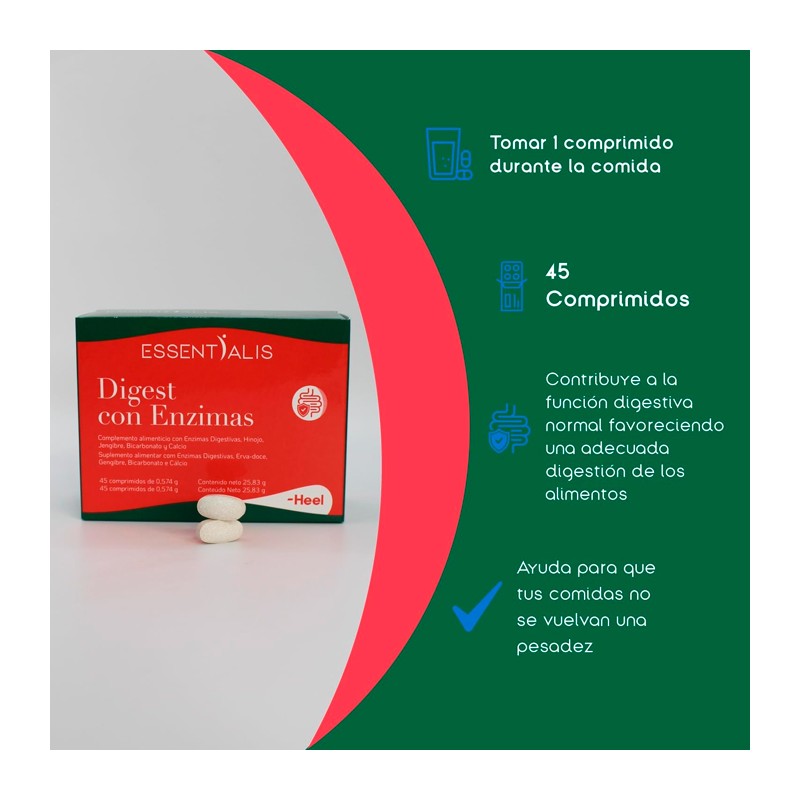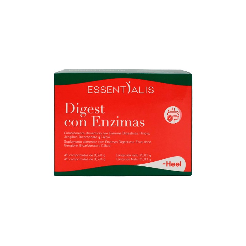 Digest con Enzimas Essentialis Heel (45 comprimidos) es un complemento alimenticio formulado con enzimas digestivas y extractos naturales que favorecen una digestión óptima, reduciendo la sensación de pesadez, hinchazón y molestias digestivas después de las comidas.
