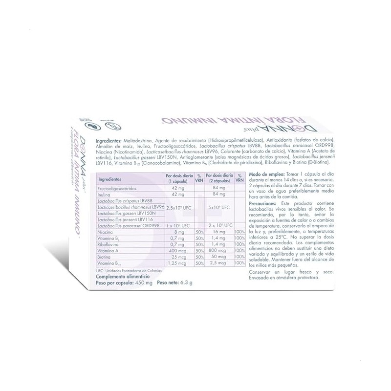 Donnaplus Flora Íntima Inmuno (14 cápsulas) es un complemento desarrollado con una combinación única de cepas probióticas específicas (como Lactobacillus rhamnosus y Lactobacillus reuteri), junto con vitamina D y zinc, que actúan sinérgicamente para mantener el equilibrio de la flora vaginal y estimular el sistema inmunitario.