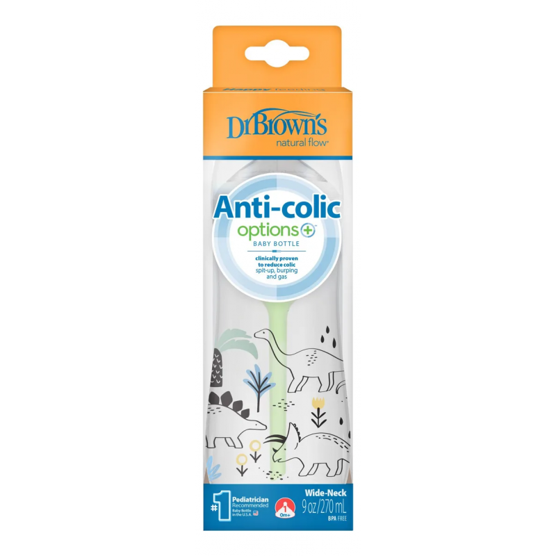 Biberón de boca ancha Dr. Brown’s Options+ de 270 ml, con diseño de dinosaurio. Favorece una alimentación cómoda, reduce cólicos y gases, y se adapta al ritmo natural de succión del bebé.
