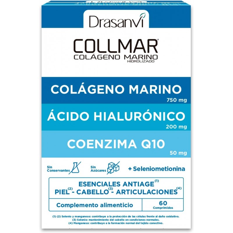 Drasanvi Collmar Colágeno Marino + Ácido Hialurónico + Coenzima Q10 (60 comprimidos) es un suplemento alimenticio diseñado para mejorar la salud de la piel, articulaciones y cabello . Su fórmula combina colágeno marino hidrolizado, ácido hialurónico y coenzima Q10, proporcionando hidratación, elasticidad y firmeza , además de contribuir al mantenimiento de las articulaciones y los tejidos conectivos.