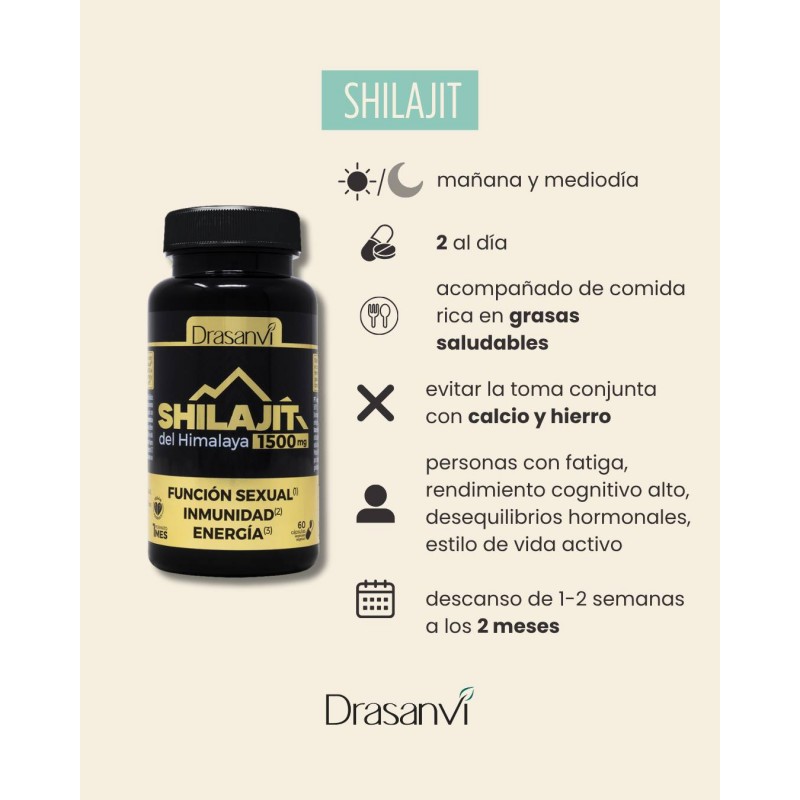 Drasanvi Shilajit del Himalaya 1500 mg es un complemento alimenticio elaborado a partir de shilajit purificado con vitamiba B6, tradicionalmente valorado por su aporte de energía y vitalidad dentro de un estilo de vida saludable.