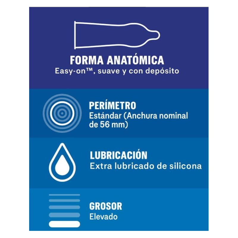 Producto sanitario clase IIaMaterial: Látex naturalColor: TransparenteForma: AnatómicaSuperficie: LisaDepósito: SíAnchura nominal: 56 mmGrosor: ligeramente más gruesoLubricado: si, sin espermicidaSustancias activas: noPropiedades:Ligeramente más gruesos y con una dosis extra de lubricante para unaseguridad adicional.