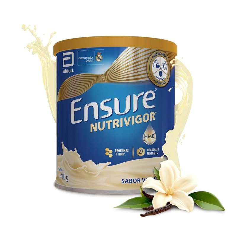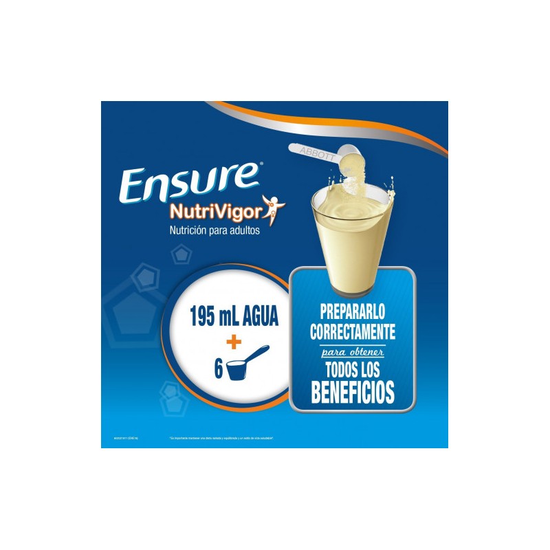 Complemento alimenticio fuente de proteinas, calcio y vitamina D que contribuyen al mantenimiento de la masa muscular y al funcionamiento normal de musculos y huesos. Ensure NutriVigor contiene calcio que contribuye al metabolismo energetico normal y vitaminas C, B2, B6, B12, niacina, acido folico y acido pantotenico que contribuyen a reducir el cansancio y la fatiga.