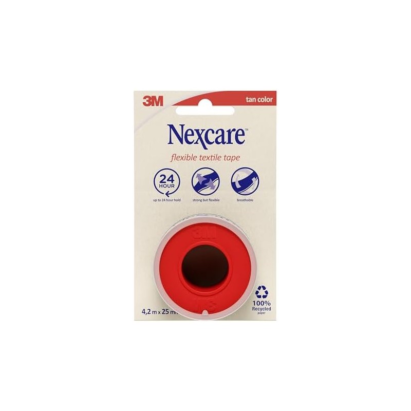 Nexcare Esparadrapo de Tela Flexible (4,2 m x 1,25 cm) es un esparadrapo hipoalergénico, resistente y transpirable, diseñado para fijar gasas, apósitos y vendajes en zonas de movimiento. Se adapta perfectamente a la piel, ofreciendo sujeción segura y comodidad duradera.