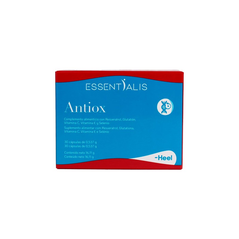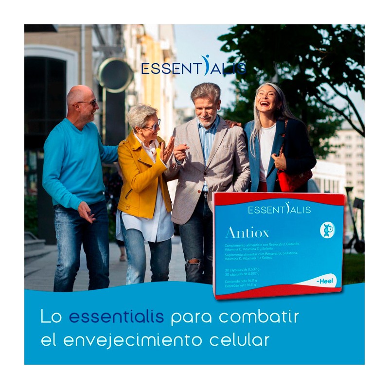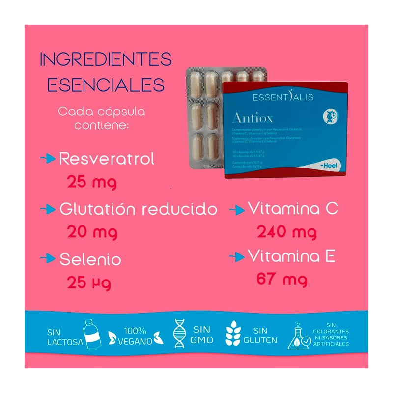 Essentialis Antiox es un complemento alimenticio que contiene resveratrol, glucatión, vitamina C, vitamina E y selenio.