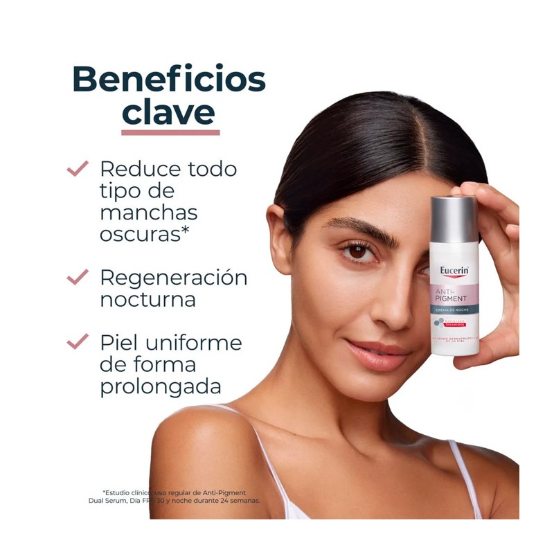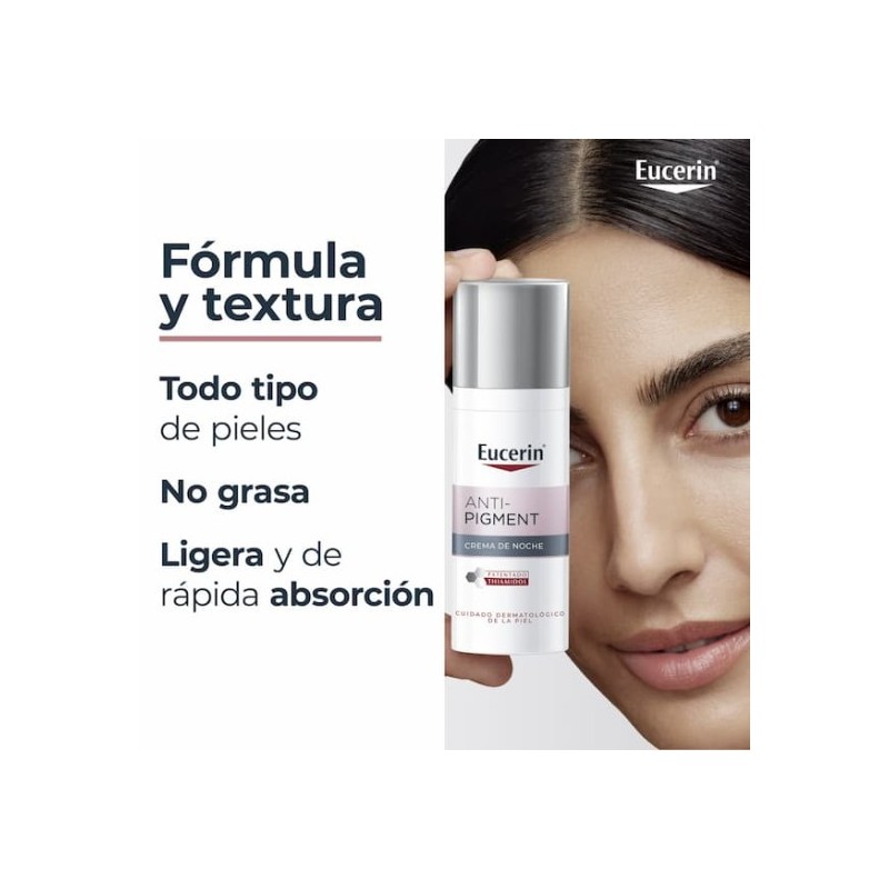 La Eucerin Anti-Pigment Crema de Noche 50 ml está formulada con Thiamidol, que disminuye la hiperpigmentación, y con ingredientes que favorecen la regeneración natural de la piel durante la noche. Su textura rica y nutritiva aporta hidratación profunda, ayudando a que la piel recupere su luminosidad y un tono uniforme al despertar. Ideal para todo tipo de piel con manchas o irregularidades en el color.