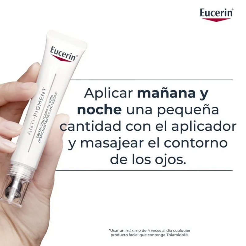 Eucerin Anti-Pigment Contorno de Ojos está especialmente formulado para tratar las ojeras hiperpigmentadas y las manchas oscuras que aparecen alrededor de los ojos. Gracias al Thiamidol, ingrediente patentado por Eucerin, actúa directamente en la raíz de la hiperpigmentación, reduciendo su intensidad y previniendo su reaparición.