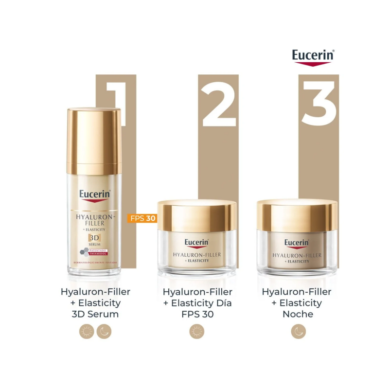 ¿CÓMO USAR EUCERIN COFRE NAVIDAD HYALURON FILLER+ ELASTICUTY 3D SERUM 30ML + 2 MINITALLAS CREMA DIA Y NOCHE?