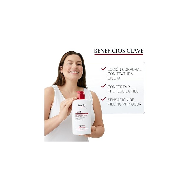 Loción hidratante ultraligera para piel sensible y muy seca. Hidrata suave y eficazmente. Se ha formulado para mejorar la resistencia y reducir la sensibilidad de la piel corporal sensible. El exclusivo sistema de pH Balance System de Eucerin contiene un tampón citrato pH5 que restablece y estimula el PH óptimo de la piel. La loción hidratante corporal también incluye dexpantenol, un ingrediente activo conocido por sus propiedades regenerativas.