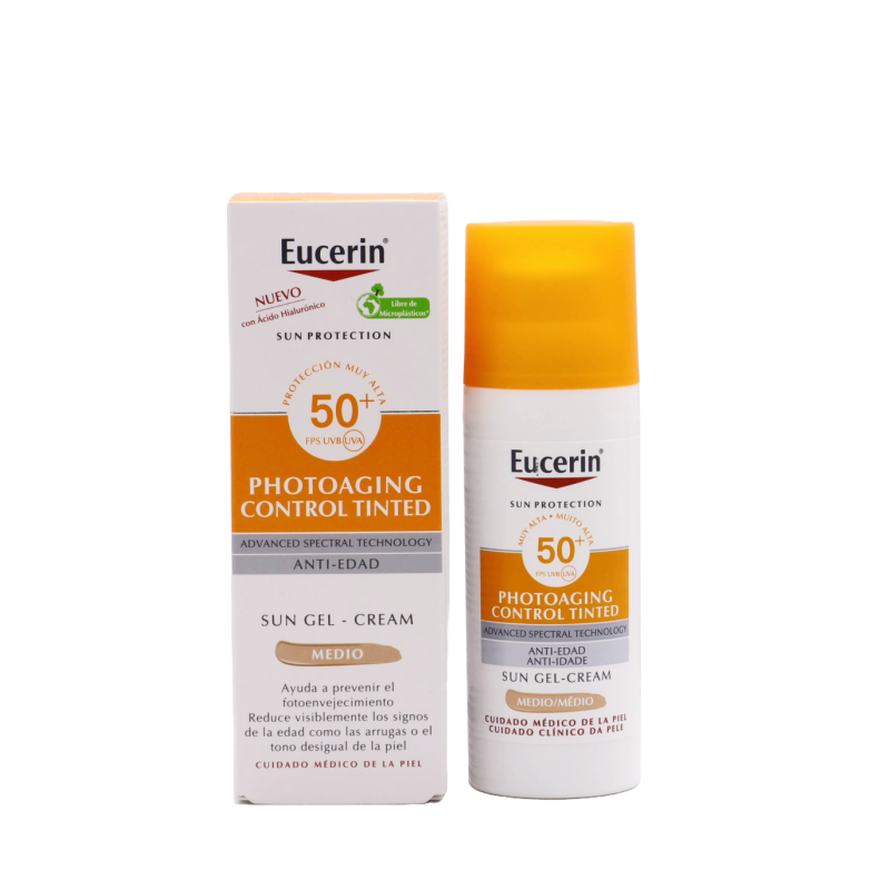 Más informaciónEucerin Sun Protection Crema Antiedad Color Medio SPF 50+ 50 ml combina alta protección solar UVA/UVB y frente a la luz visible (HEVIS) con una fórmula rica en ácido hialurónico, que hidrata intensamente la piel y suaviza las líneas de expresión.
