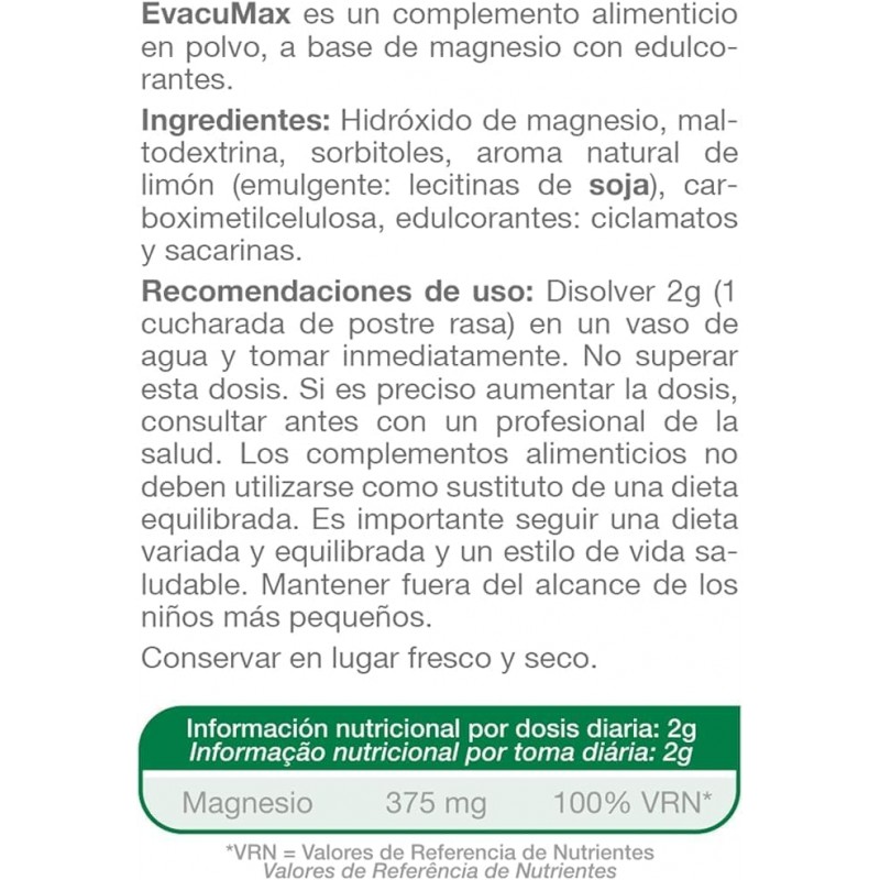 Evacumax Hidróxido de Magnesio 150 g es un complemento alimenticio formulado con alta pureza, conocido por sus propiedades laxantes suaves y antiácidas. Ayuda a regular el tránsito intestinal, combatiendo el estreñimiento ocasional sin irritar el intestino, y alivia molestias como el exceso de acidez gástrica.