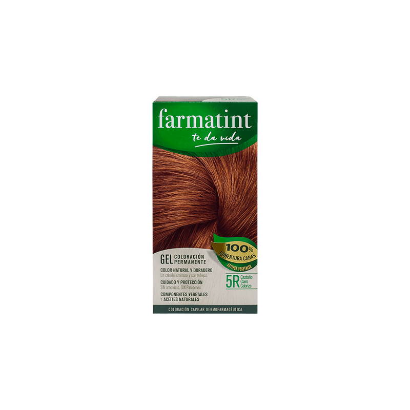 Farmatint 5R Castaño Claro Cobrizo es un tinte permanente de origen vegetal que aporta un tono castaño claro con reflejos cobrizos vibrantes, cubriendo las canas al 100% y cuidando el cabello con ingredientes naturales para un acabado brillante, duradero y saludable.