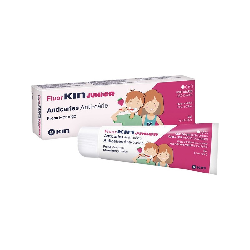 Fluor Kin Junior Gel Dentífrico 75 ml de sabor fresa es una pasta dental formulada especialmente para niños a partir de los 6 años. Con su agradable sabor a fresa, ayuda a fortalecer el esmalte dental y a proteger contra las caries, incentivando una rutina de cepillado divertida y efectiva.