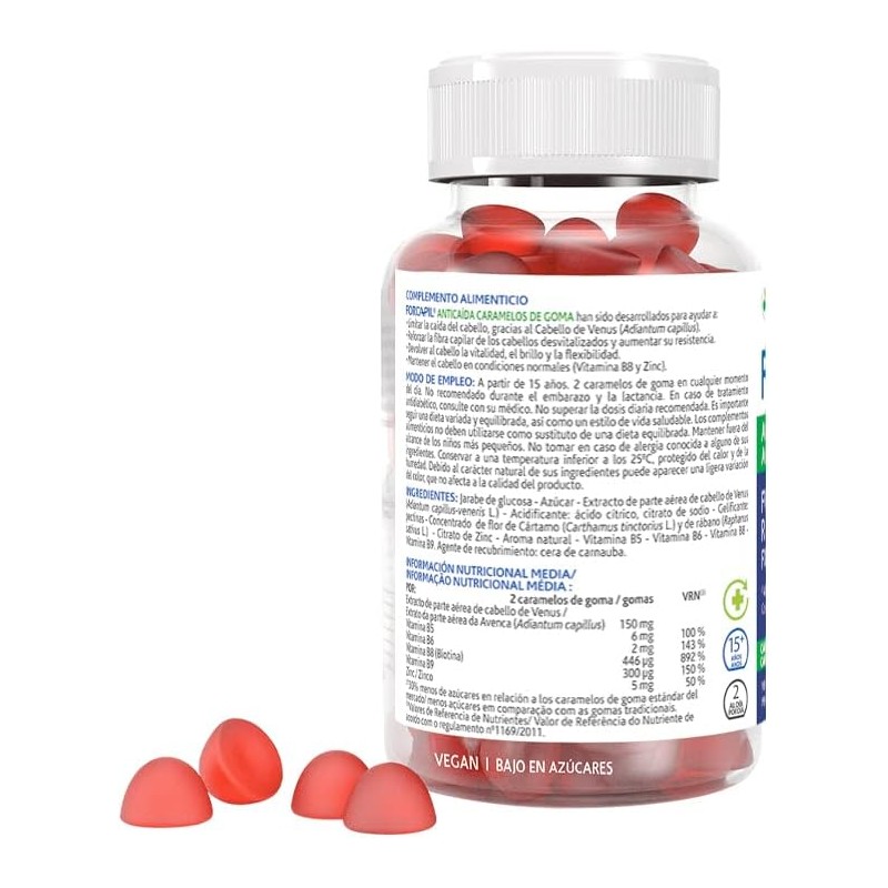 Forcapil Anticaída Caramelos de Goma es un complemento alimenticio de Arkopharma formulado con el complejo Hair Activ’ + Fortify (Vitaminas B5, B6, B8, B9 y Zinc) junto al extracto de Cabello de Venus (Adiantum capillus). Su misión: fortalecer la fibra capilar, frenar la caída del cabello y mejorar su brillo.
