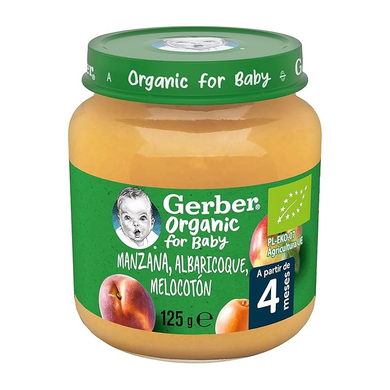 El tarrito Gerber Organic manzana, melocotón y albaricoque es una deliciosa combinación de frutas orgánicas, pensada para ofrecer a tu bebé un postre o merienda natural, nutritiva y de sabor suave.