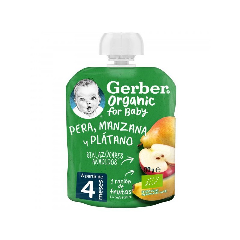 El Gerber Organic pera, manzana y plátano pouch 90 g es un práctico puré de frutas orgánicas en formato pouch, pensado para aportar a tu bebé una opción nutritiva, deliciosa y fácil de llevar a cualquier parte.