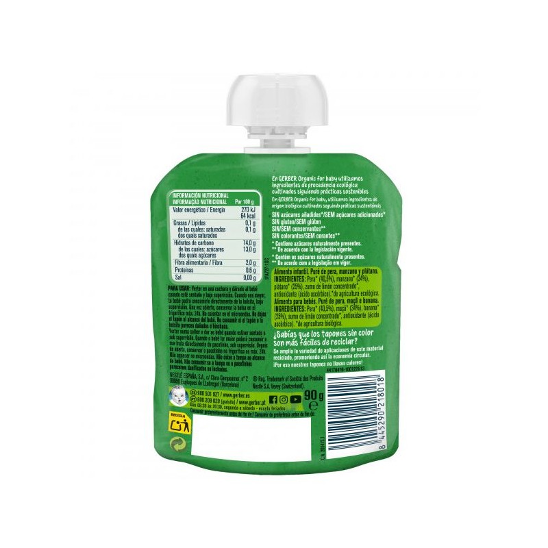 Más informaciónEl pouch de Gerber Organic pera, manzana y plátano está elaborado con frutas de cultivo orgánico certificado, cuidadosamente seleccionadas para garantizar un sabor natural y una textura suave, perfecta para los más pequeños. Sin azúcares añadidos, conservantes ni colorantes, este puré se convierte en una opción saludable para introducir nuevas frutas en la dieta de tu bebé y fomentar una alimentación equilibrada.