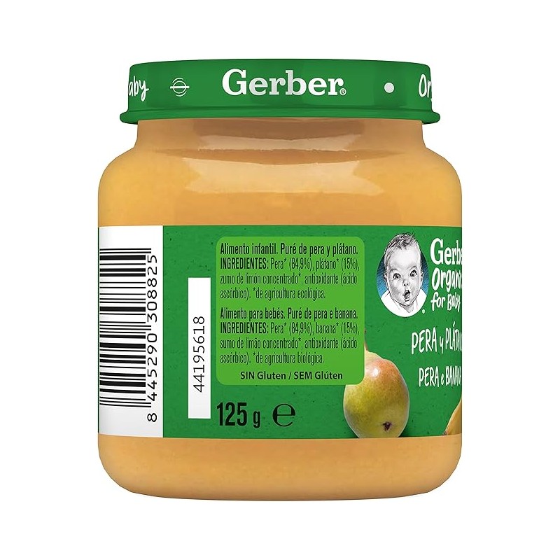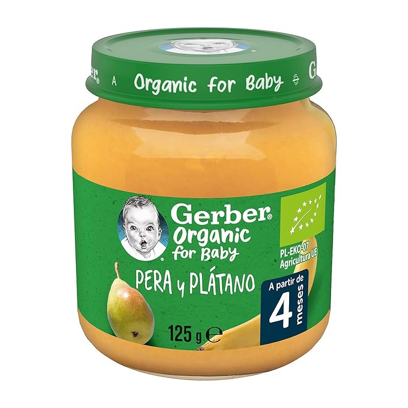 El Gerber Organic Pera y Plátano tarrito 125 g es un puré de frutas orgánicas, suave y naturalmente dulce, ideal para la alimentación complementaria de tu bebé desde los 4 meses.