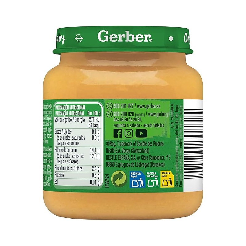 No contiene azúcares añadidos, conservantes ni colorantes, solo el dulzor natural de la fruta. Gracias a su formato en tarrito de vidrio, es una opción segura, práctica y lista para consumir, ideal para introducir nuevas frutas de forma saludable en la dieta diaria de tu pequeño.