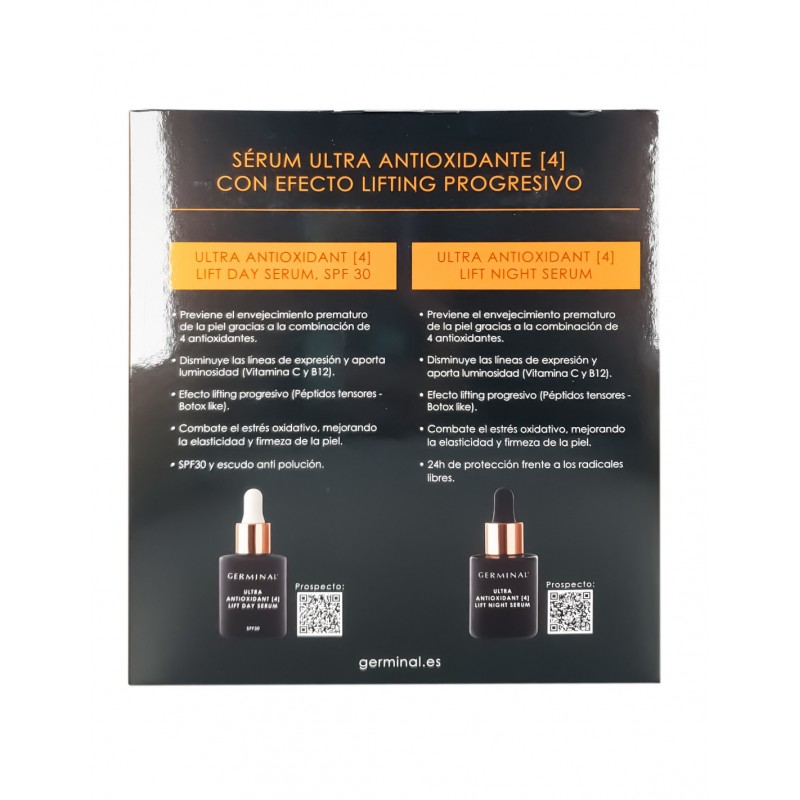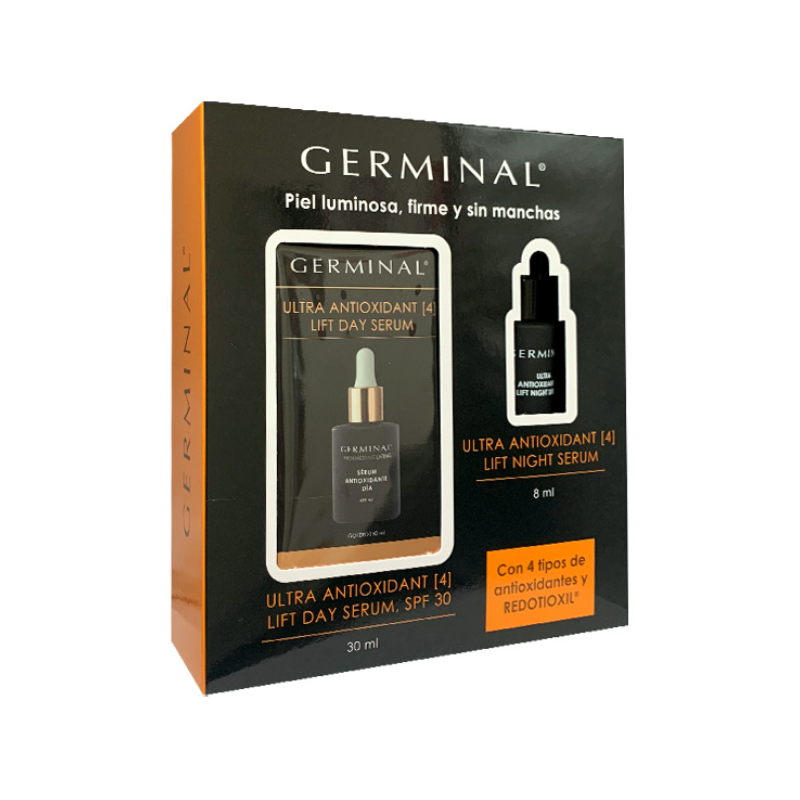 El Pack Germinal Ultra Antiox [4] Lift Pack combina un sérum de día con SPF30 y un mini sérum de noche de regalo, pensado para ofrecer luminosidad, suavidad y un aspecto revitalizado durante todo el día y la noche.