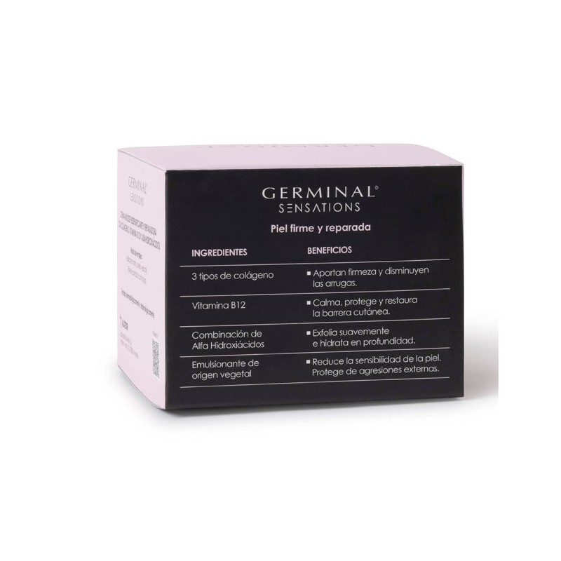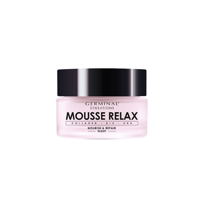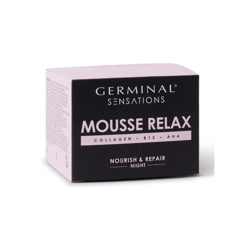 Germinal Sensations Mousse Relax Crema de Noche 50 ml es una crema en textura mousse que nutre, suaviza y ayuda a renovar la piel gracias a su combinación de colágeno, vitamina B12 y AHA, ofreciendo un despertar con el rostro más liso, descansado y luminoso.