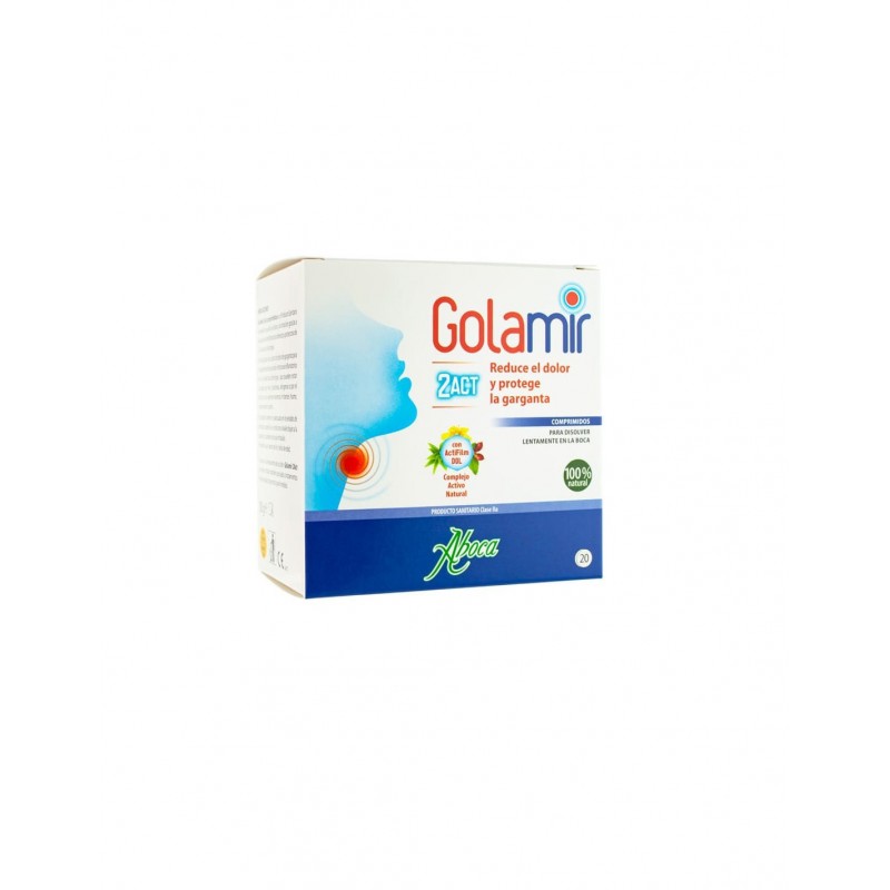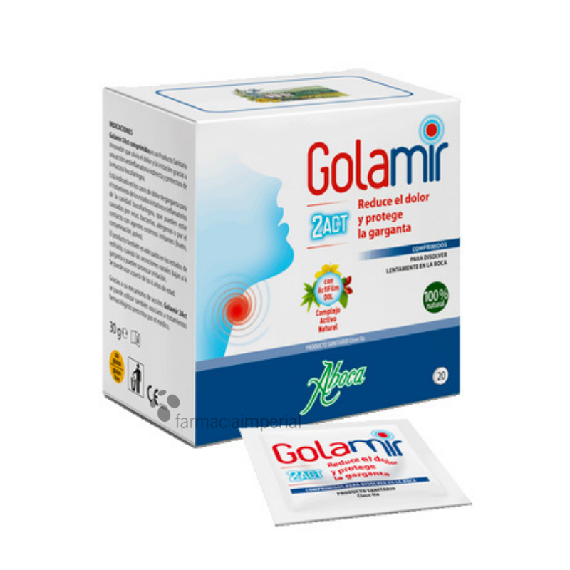 Golamir 2Act comprimidos es un producto natural que alivia el dolor, la irritación y el escozor de garganta, actuando directamente sobre la mucosa inflamada y protegiéndola frente a agentes externos.