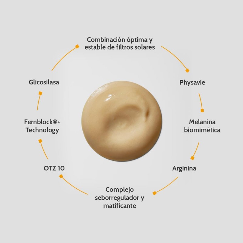 Contiene el complejo activo Fernblock®, filtros específicos y activos reparadores y antioxidantes. En su fórmula se encuentra Glicosilasa, Physavie, OTZ 10, Melanina biomimética y Arginina.