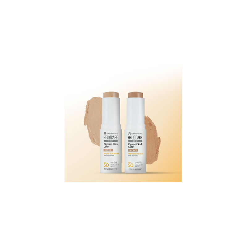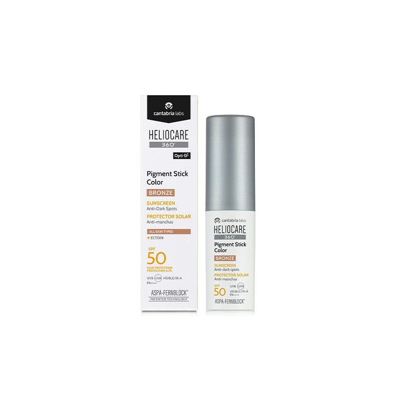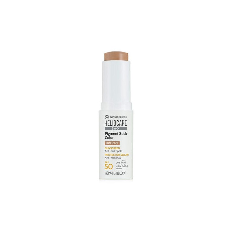Heliocare 360º Pigment Stick SPF50+ Color Bronze es un innovador fotoprotector en formato stick diseñado para proteger, tratar y camuflar las manchas cutáneas de forma cómoda y eficaz. Su fórmula combina muy alta protección solar SPF50+ con activos específicos que ayudan a prevenir y mejorar las manchas provocadas por el sol en pieles más oscuras o bronceadas.