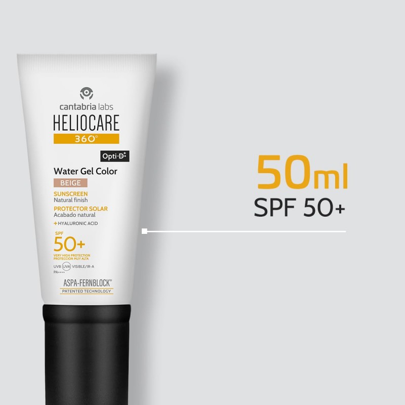 Heliocare 360º Color Water Gel SPF 50+ Beige combina la eficacia fotoprotectora de amplio espectro con una cobertura natural gracias a su tono beige adaptable, que unifica el tono de piel y disimula imperfecciones sin efecto máscara.