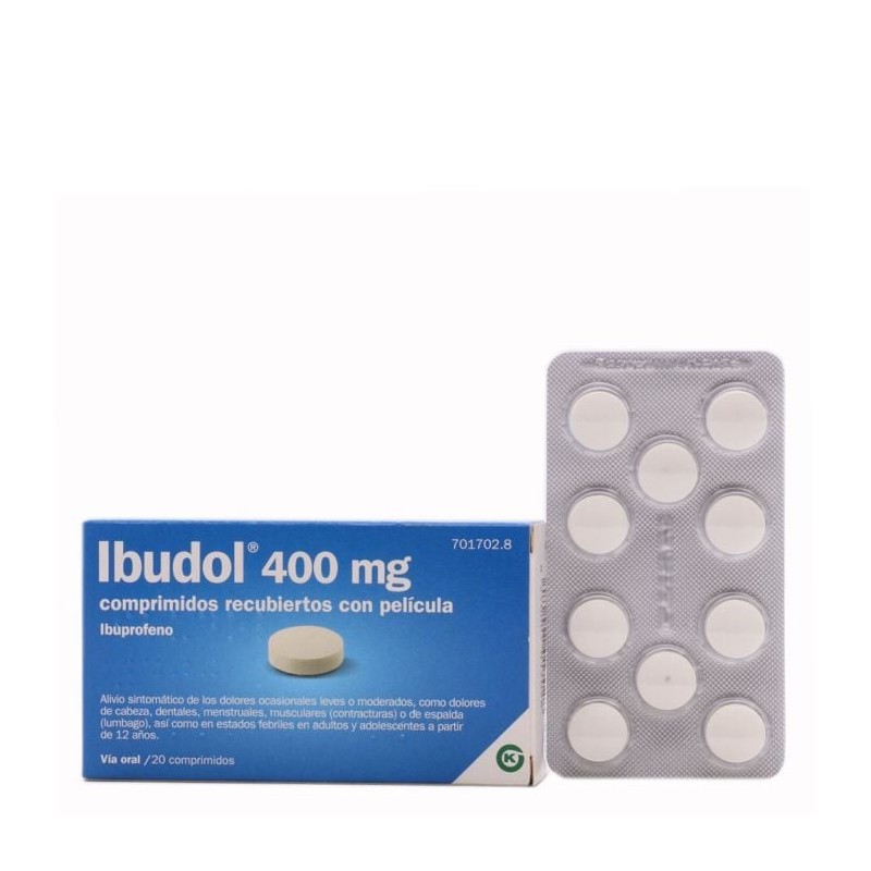 Ibudol 400 mg 20 comprimidos recubiertos, analgésico y antiinflamatorio para aliviar dolor e inflamación.