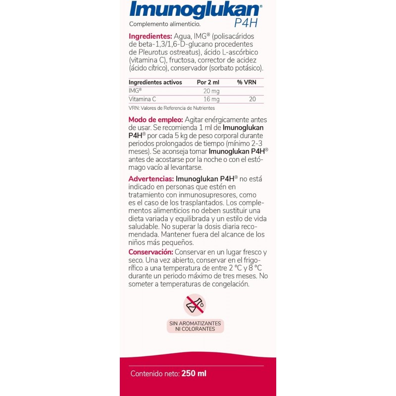 Complemento alimenticio a base de Imunoglukan y vitamina C que puede resultar de utilidad para ayudar a la función normal del sistema inmunitario, gracias a su contenido en vitamina C.