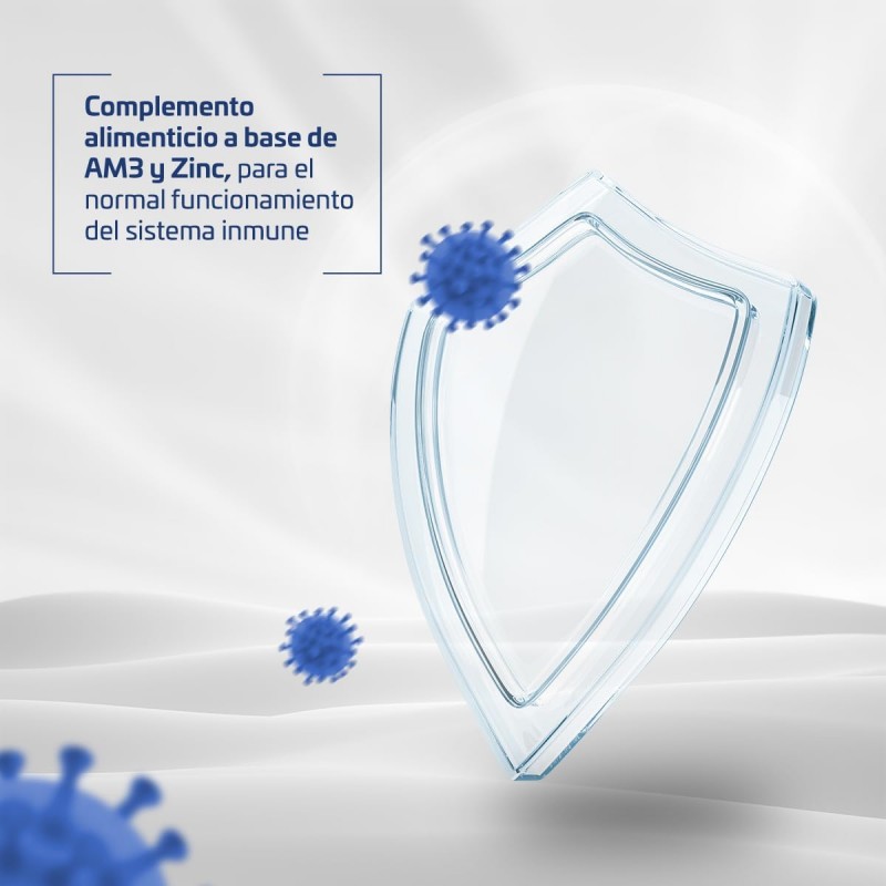 Complemento alimenticio con AM3®, zinc y vitamina C, que ayuda a reforzar las defensas naturales y proteger frente a agresiones externas.