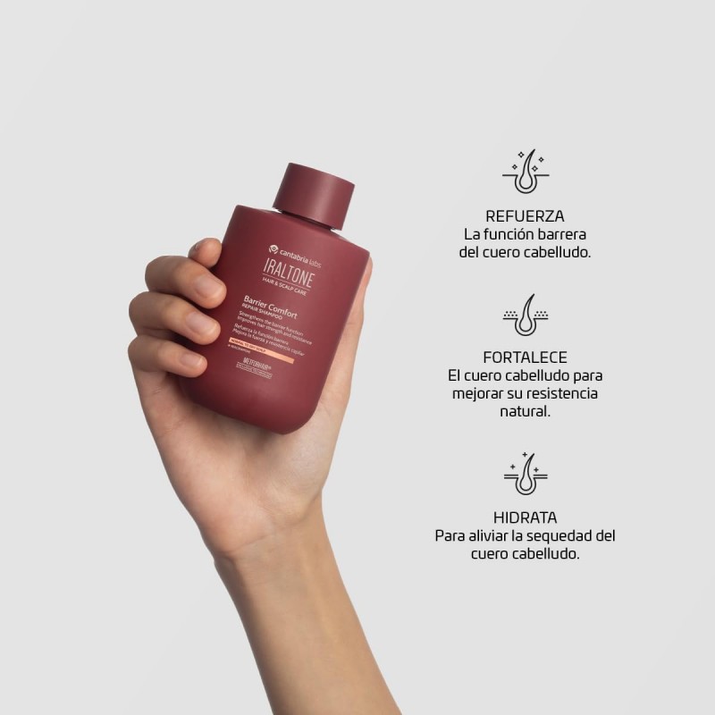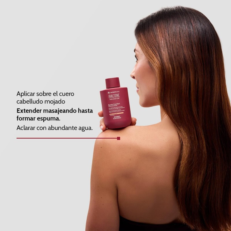 Champú Iraltone Barrier Comfort Repair con niacinamida, formulado para una limpieza suave y respetuosa, que refuerza la función barrera del cuero cabelludo, alivia la sequedad y restaura la fuerza del cabello.