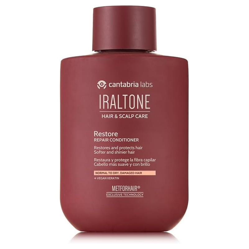 Acondicionador Iraltone Restore Repair para cabello normal y seco, con queratina vegetal y patente MetforHair®, que refuerza y restaura la fibra capilar, protegiéndola de la rotura y aportando suavidad y brillo.