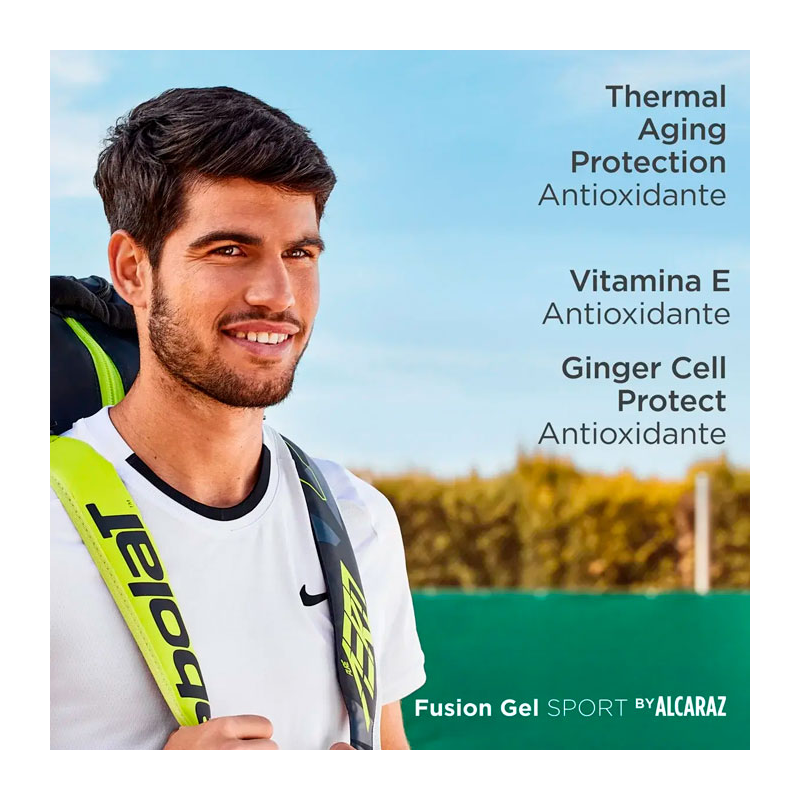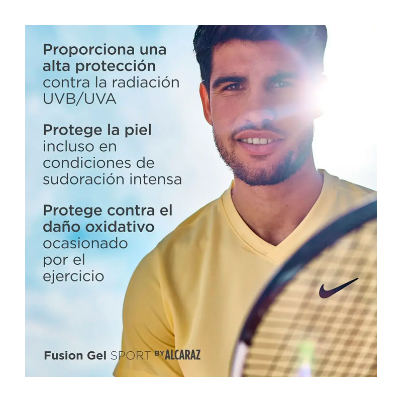 Fotoprotector corporal en gel ultraligero y refrescante SPF 50, especialmente formulado para deportistas e inspirado y diseñado por el tenista español Carlos Alcaraz.
