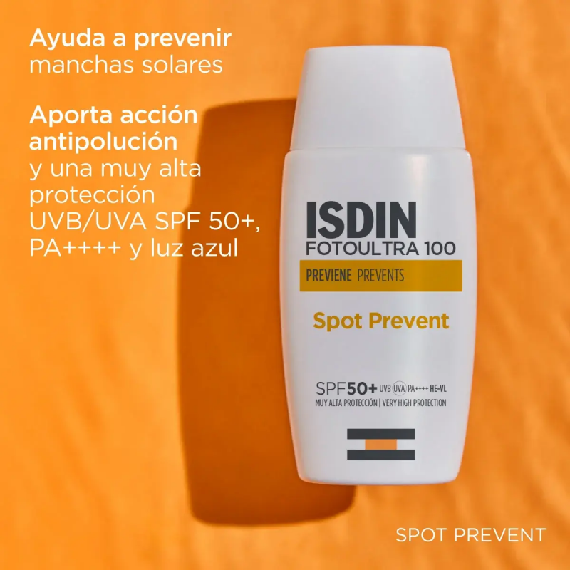 ISDIN Fotoultra 100 Spot Prevent SPF 50+ 50 ml es un fotoprotector facial de alta eficacia que ayuda a prevenir la formación de manchas pigmentarias inducidas por el sol. Ideal para pieles con tendencia a la hiperpigmentación o tras tratamientos dermatológicos.