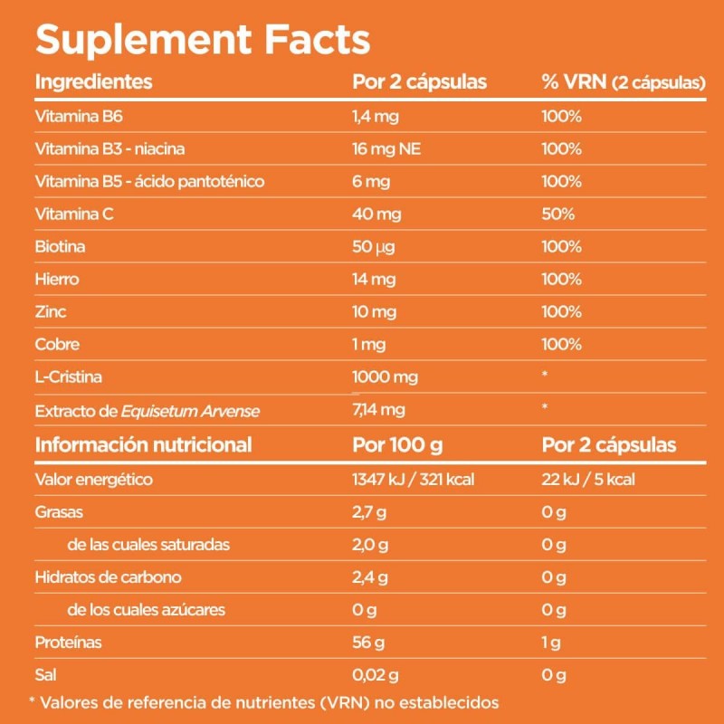 Contiene L-cistina, aminoácido esencial en la síntesis de queratina, que fortalece el cabello y las uñas, junto con Serenoa repens, que ayuda a inhibir la acción de la 5-alfa-reductasa, enzima responsable de la caída capilar androgénica. Además, la biotina, zinc y hierro contribuyen al mantenimiento normal del cabello, mientras que las vitaminas B3, B5 y D estimulan la regeneración celular y aportan energía a las raíces capilares.