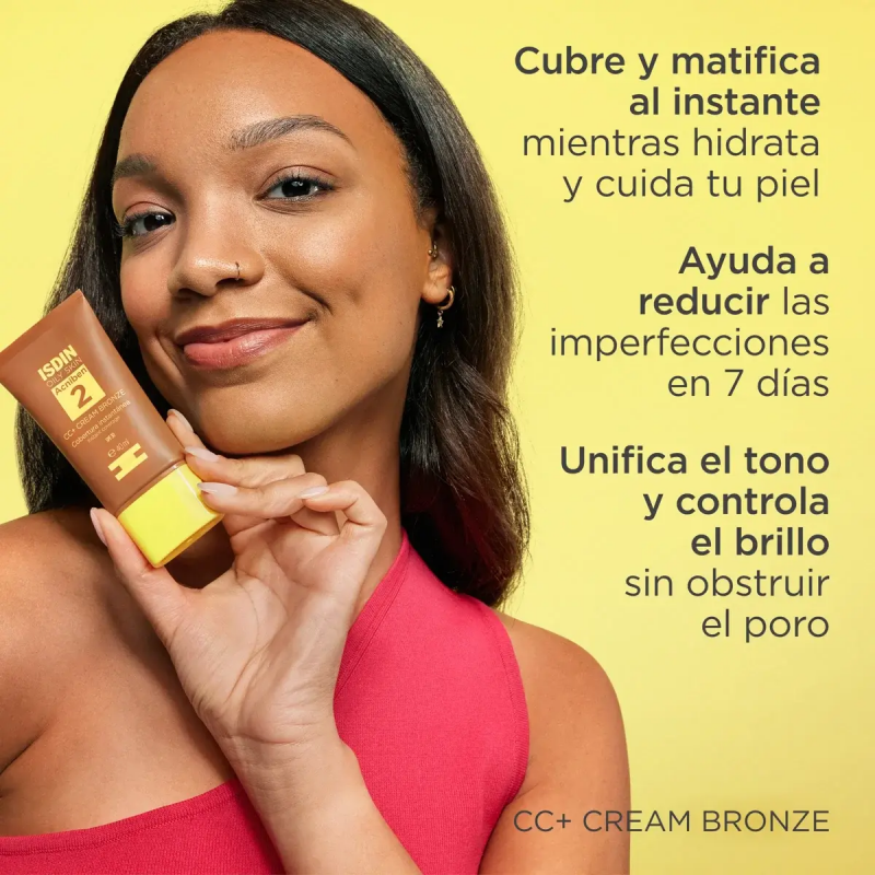 Más informaciónLa CC+ Cream Bronze Acniben de ISDIN está especialmente formulada para el cuidado diario de las pieles grasas o con tendencia acneica con fototipo bronceado u oscuro. Aporta cobertura ligera a media mientras trata activamente las imperfecciones, ayudando a mejorar visiblemente el aspecto de la piel en tan solo 7 días¹.