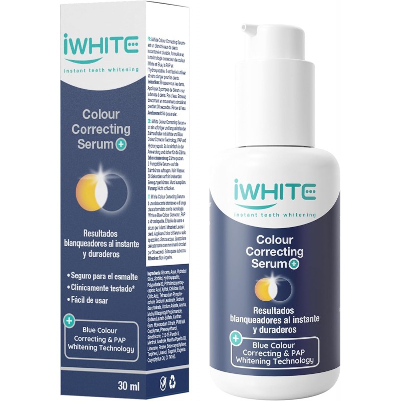 iWhite Serum Colour Corrector (30 ml) es un suero corrector de color diseñado para neutralizar los tonos amarillentos de los dientes y aportar un blanqueamiento óptico inmediato. Su tecnología de pigmentos violetas ayuda a equilibrar el color dental, logrando una sonrisa más brillante y uniforme.