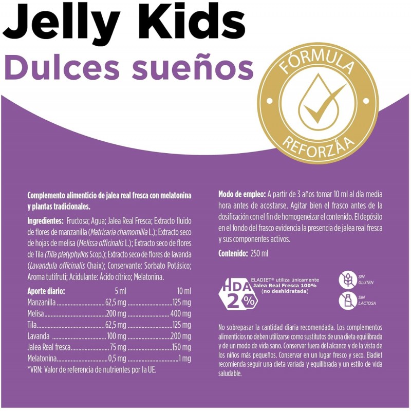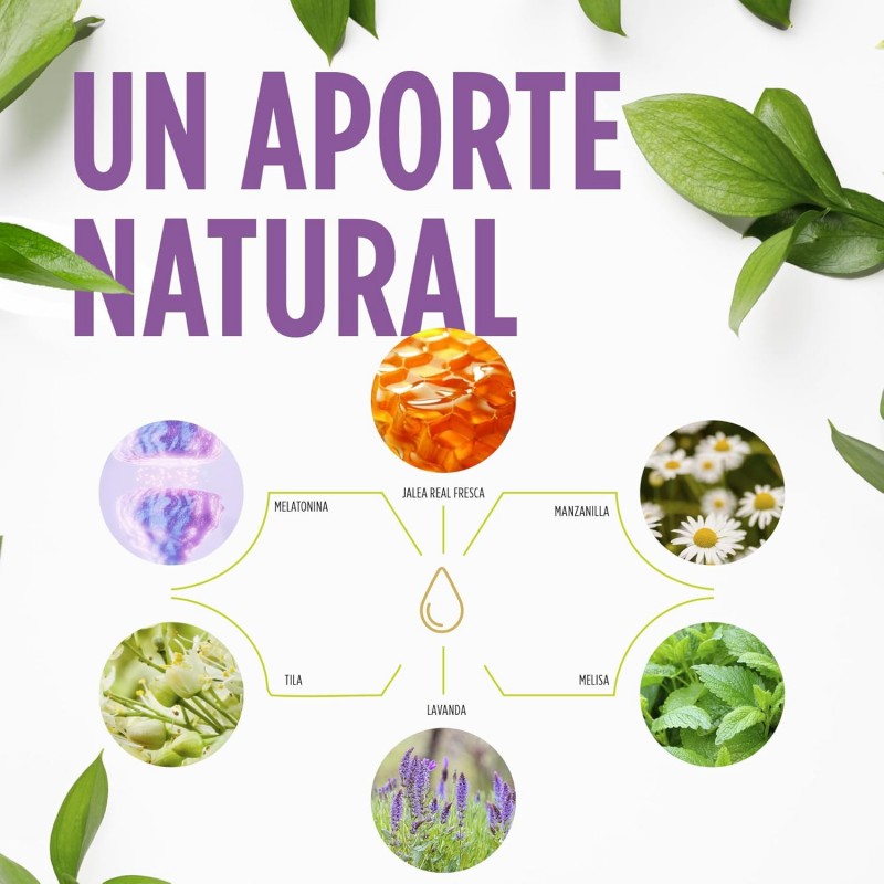 INGREDIENTES: Jarabe de fructosa, agua, extracto de melisa (melissa officinalis), extracto de lavanda (lavandula officinalis), jalea real fresca; extracto de manzanilla (matricaria chamomilla), extracto de tila (tilia americana), aroma de frutas, conservantes: sorbato potásico, acidificante: ácido cítrico y melatonina.