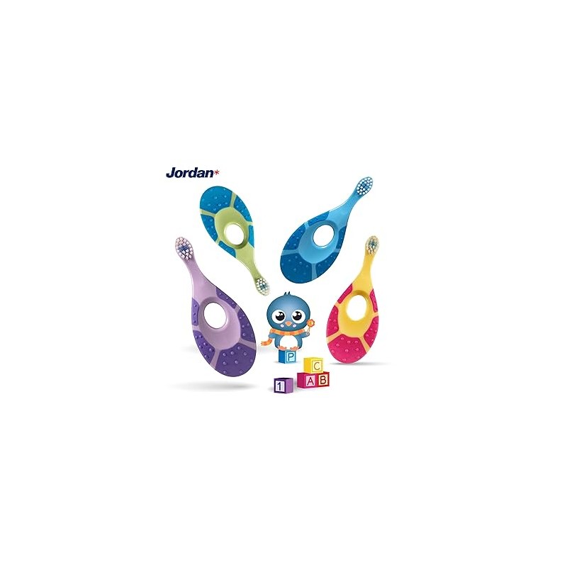 El cepillo dental Jordan 0-2 años está diseñado para cuidar los primeros dientes de tu bebé con la máxima suavidad. Sus cerdas extra suaves limpian delicadamente dientes y encías, mientras que el mordedor integrado ayuda a aliviar las molestias de la dentición. Su diseño seguro y ergonómico permite que el bebé lo sujete fácilmente, haciendo del cepillado un momento cómodo y agradable.