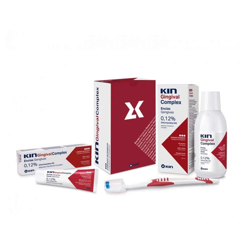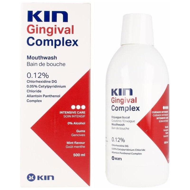 Más informaciónKin Gingival Complex Enjuague es una solución bucal de 500 ml diseñada para ofrecer un cuidado intensivo y específico de las encías. Su fórmula avanzada combina 0.12% de clorhexidina y alantoína para proporcionar una potente acción antiséptica y antiinflamatoria.