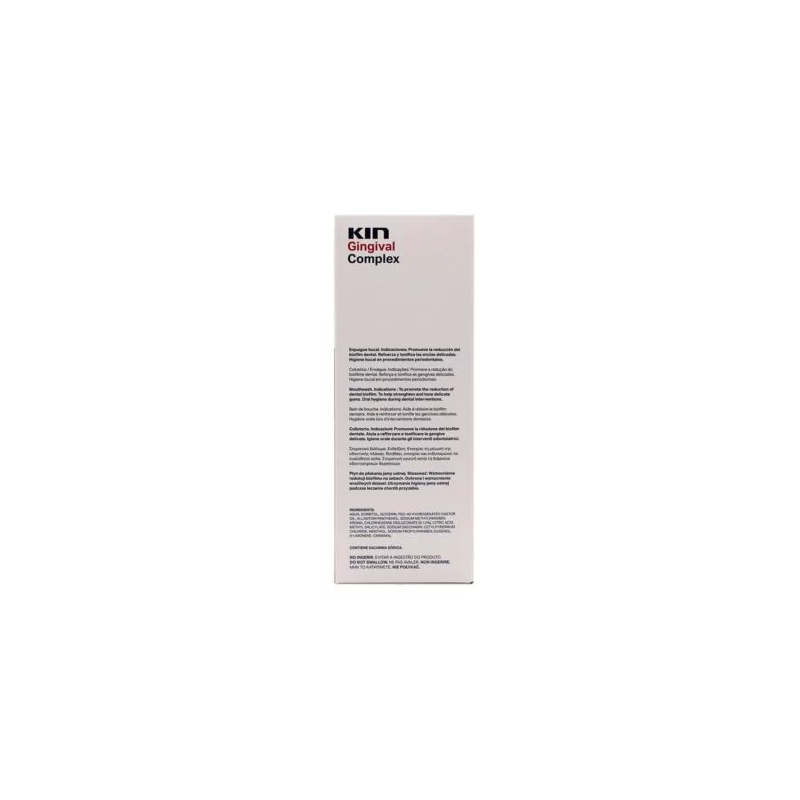 Este enjuague es ideal para el tratamiento y prevención de la gingivitis y periodontitis, así como para el cuidado postoperatorio de procedimientos dentales. Kin Gingival Complex deja una sensación de frescura prolongada en la boca, contribuyendo a un aliento limpio y una salud bucal óptima.
