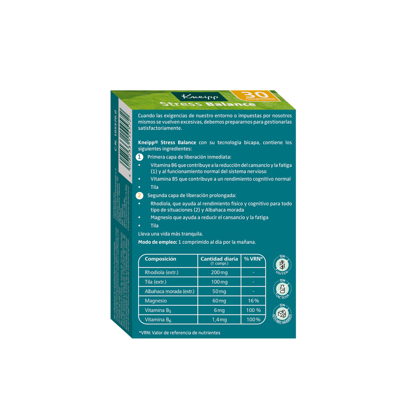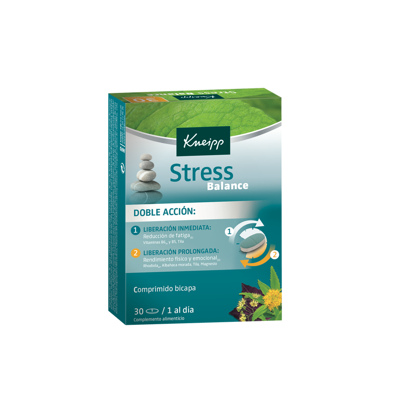 Kneipp Stress Balance 30 comprimidos es un complemento alimenticio formulado con extracto de azafrán, vitaminas del grupo B (B1, B2, B6, B12) y ácido pantoténico, una combinación única diseñada para favorecer el equilibrio emocional, mejorar el estado de ánimo y ayudar al organismo a afrontar situaciones de estrés físico y mental.