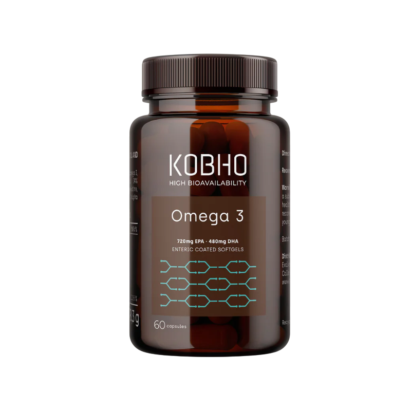 KOBHO Omega 3 es un suplemento nutricional en cápsulas blandas que aporta una fuente pura y concentrada de ácidos grasos omega-3, obtenidos a partir de aceite de pescado de alta calidad. Cada dosis contiene una proporción ideal de EPA (ácido eicosapentaenoico) y DHA (ácido docosahexaenoico), conocidos por su papel clave en la protección de la salud cardiovascular, la función cognitiva y la visión.