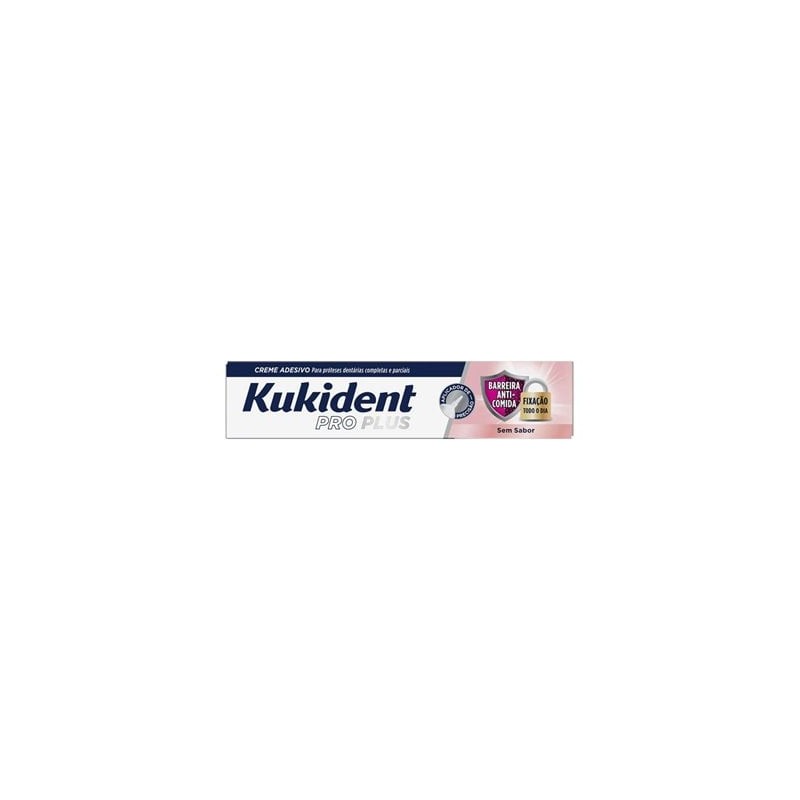 Kukident Pro Plus Barrera Anticomida Sin Sabor 40 g proporciona fijación fuerte y precisa durante todo el día, creando una eficaz barrera que evita la entrada de alimentos bajo la prótesis dental.