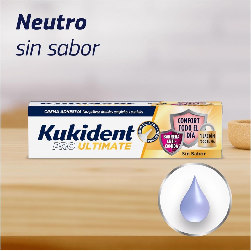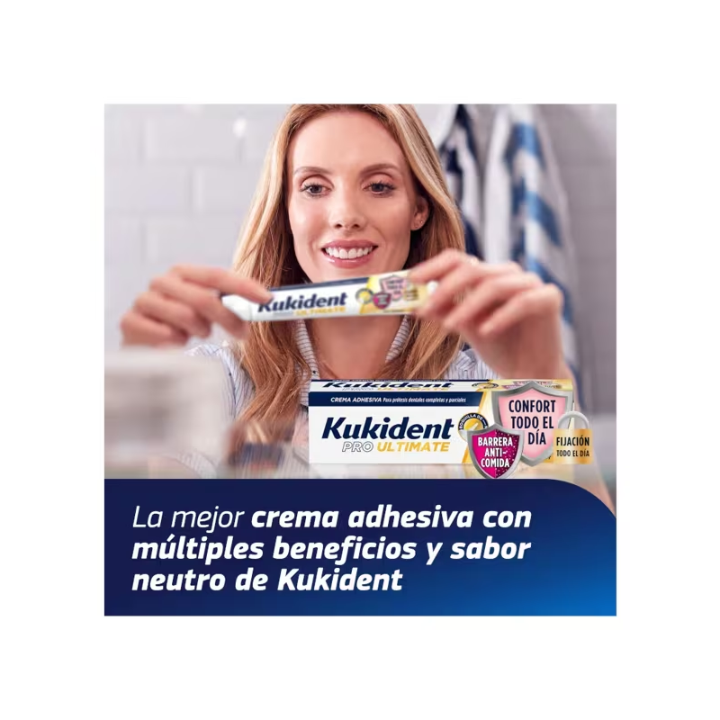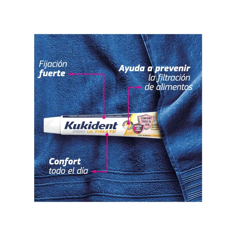 Kukident Pro Ultimate Sin Sabor Confort Todo el Día es una crema adhesiva premium para prótesis dentales diseñada para brindar una fijación superior y un ajuste cómodo desde la mañana hasta la noche.