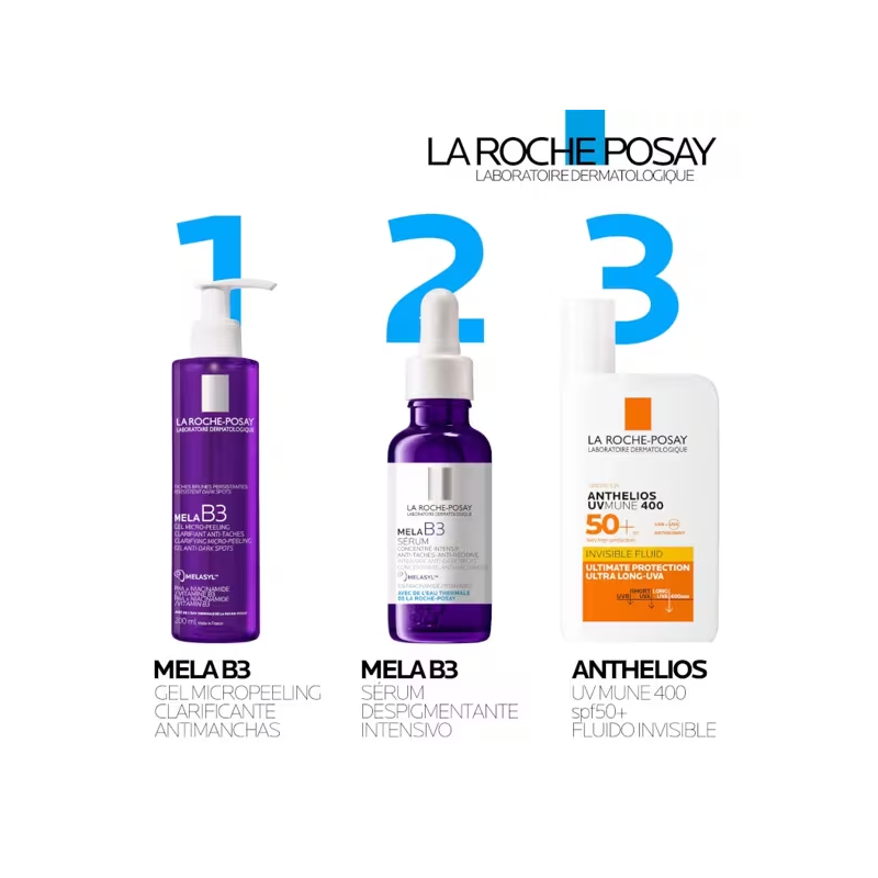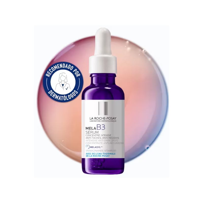 Más informaciónMela B3 Sérum de La Roche-Posay es un tratamiento dermatológico avanzado que ayuda a corregir y prevenir manchas oscuras, unificando el tono y aportando luminosidad al rostro. Su fórmula combina Melasyl™, un innovador activo despigmentante que actúa sobre el origen de las manchas, con vitamina B3 (niacinamida), que calma y fortalece la barrera cutánea.